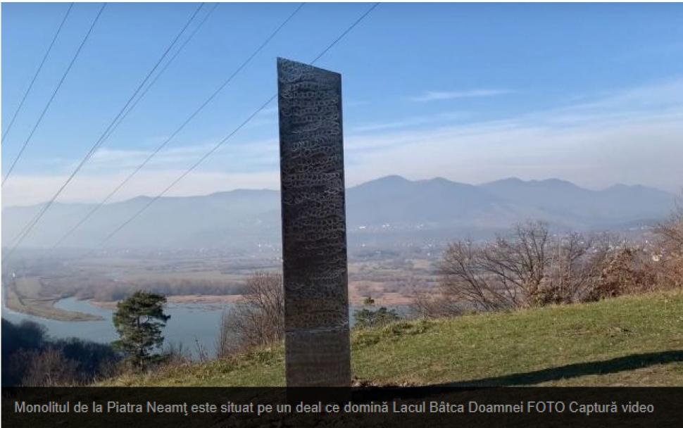 „Acesta este monolitul geamăn celui găsit în Utah. Se află deasupra uni sit arheologic, o cetate dacică. Mergem pe o cărare către vechea cetate, care ar trebui să fie deasupra. Încerc să iau o imagine de ansamblu a situaţiei de aici. Aceasta este o perspectivă (cameramanul surprinde locul, în fundal zărindu-se masivul Ceahlău - n.red.). Acesta este considerat un munte sfânt al românilor. Şi aceasta este o perspectivă completă a monolitului. Se pare că are o textură ciudată. Este interesant că străluceşte. Ce peisaj uluitor!“, spune martorul ocular, descriind apariţia de pe culmea Bâtca Doamnei.