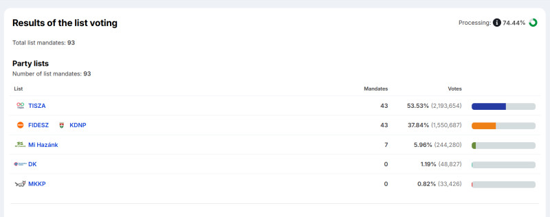 Dintre acestea, Tisza are 93 de mandate uninominale și 39 pe listele de partid, în timp ce Fidesz și KDNP obțin 46 de mandate pe listele de partid și 13 uninominale.
