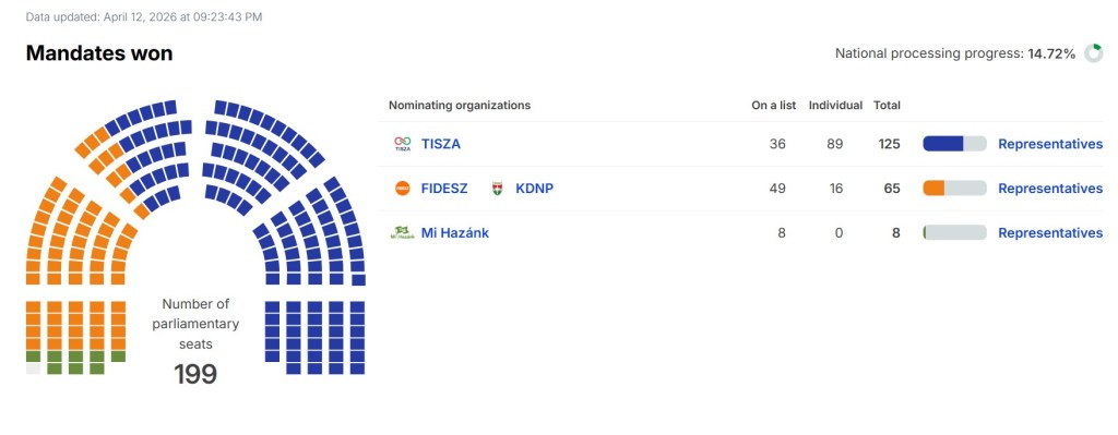 Primele rezultate parțiale oficiale indică un avantaj pentru Tisza, partidul lui Péter Magyar, care ar avea 110 locuri în parlamentul cu 199 de locuri.