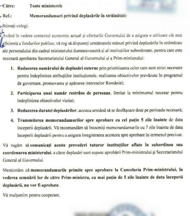 „Având în vedere contextul economic actual și eforturile Guvernului de a asigura o utilizare cât mai eficientă a fondurilor publice, vă rog să dispuneți următoarele măsuri privind deplasările în străinătate ale personalului din cadrul ministerului dumneavoastră și al instituțiilor subordonate, pentru care este necesară aprobarea Secretariatului General al Guvernului și a Prim-ministrului”, se arată într-o adresă oficială transmisă de Guvern.