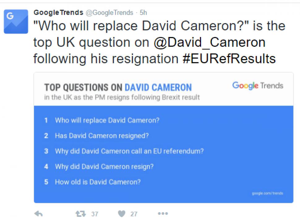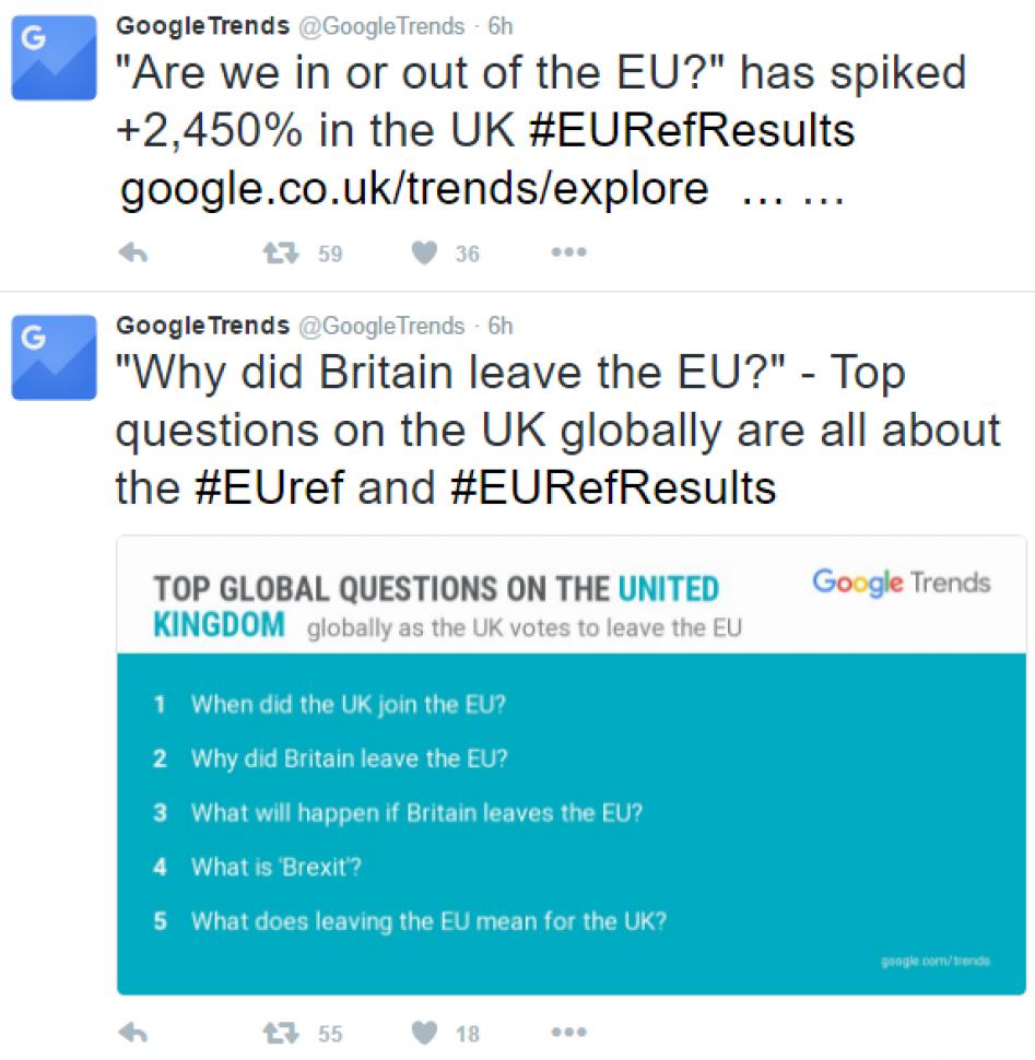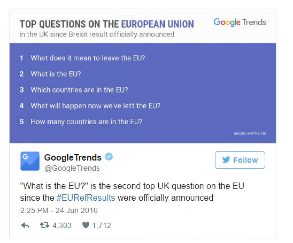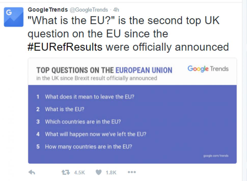 Dar se pare că sunt foarte mulți britanici care nu știu nici măcar ce este Uniunea Europeană. Conform Google Trends, foarte mulți britanici au căutat, după ce s-au închis urnele de vot, ce este Uniunea Europeană, pe Google. Și mulți încă mai caută și la ora asta....