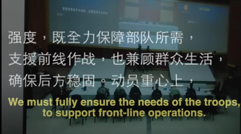 „Declaratia Comisiei Nationale de Aparare a afirmat in mod clar ca provincia noastra va coordona punerea in aplicare a celor sapte tipuri de resurse de razboi la nivel national, inclusiv, in principal, 64 de nave de 10.000 de tone roll-on/roll-off, 38 de avioane, 588 de vagoane de tren si 19 instalatii civile, inclusiv aeroporturi si docuri", s-a auzit un vorbitor in clipul audio.