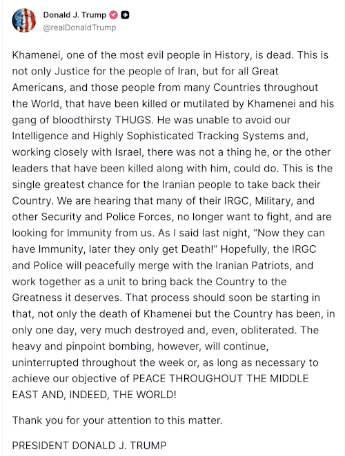 După ce a confirmat moartea lui Khamenei într-o postare pe Truth Social, Trump a declarat că aceasta este „cea mai mare șansă pentru poporul iranian de a-și recupera țara”. El a mai spus că unii oameni din Iran „caută” imunitate. „Auzim că mulți dintre membrii IRGC (Gărzilor Revoluționare), militari și alte forțe de securitate și poliție nu mai vor să lupte și caută imunitate din partea noastră”, a spus Trump.