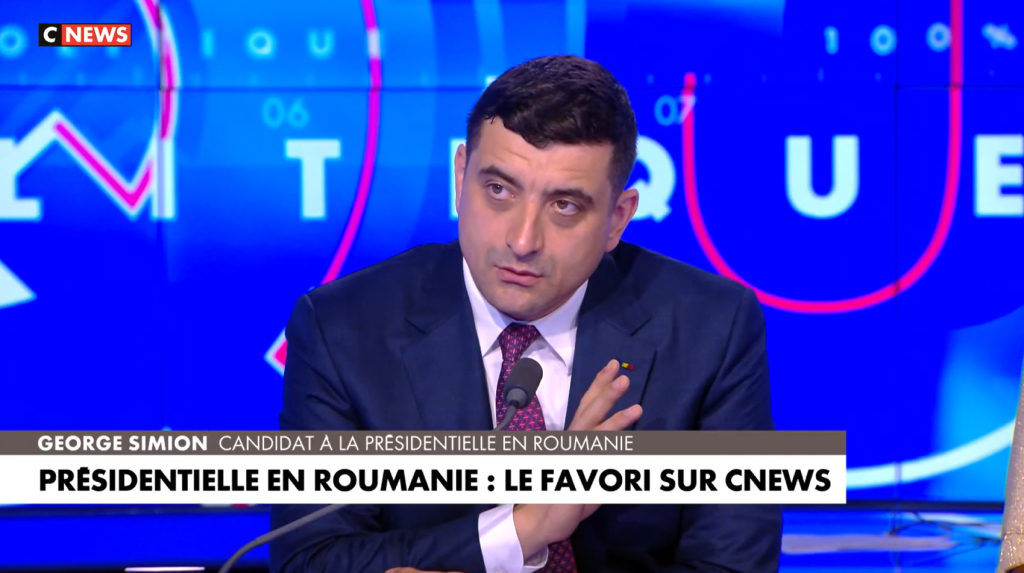Aflat joi la Paris, candidatul AUR la Președinția României, George Simion, a participat la emisiunea „100 politique” de la postul francez de televiziune CNews , moderată de Gauthier le Bret.