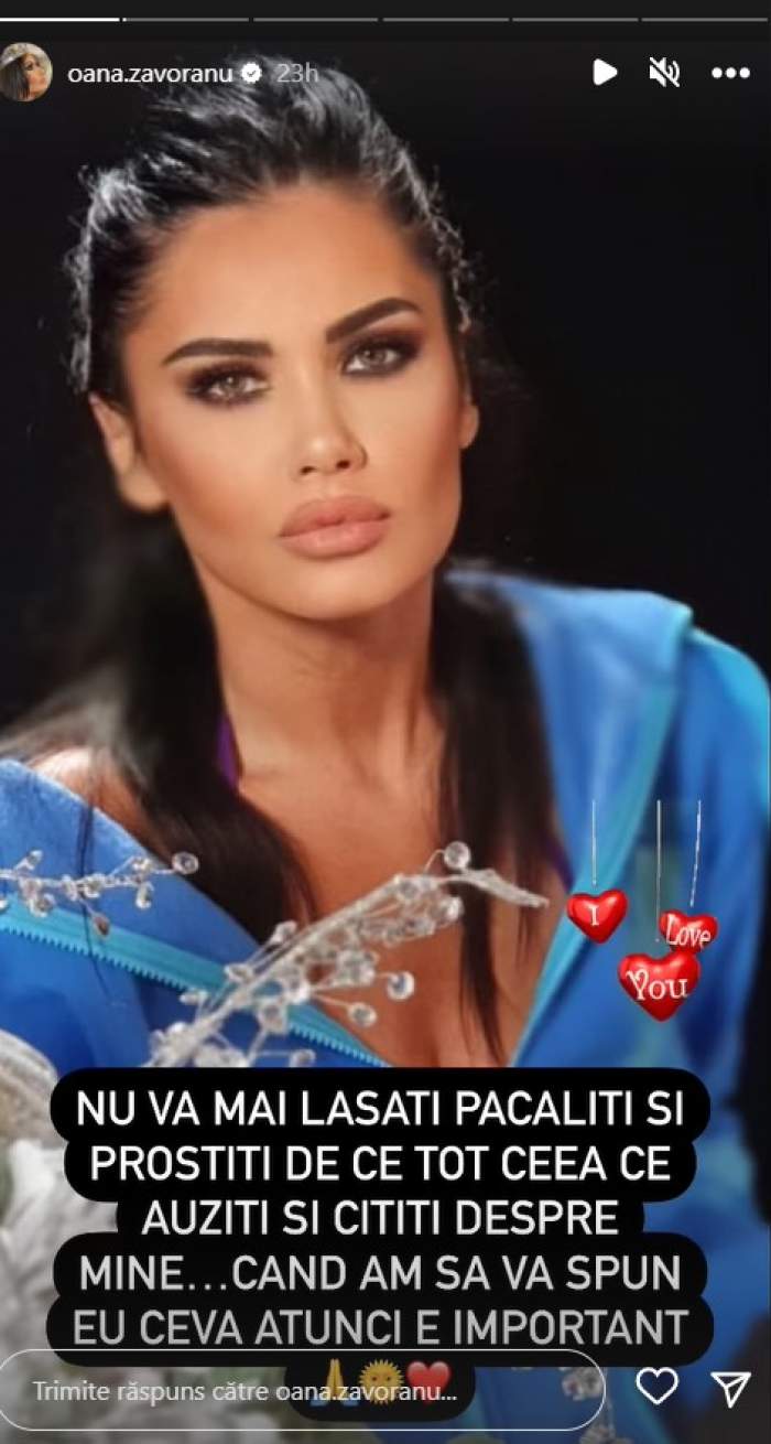 „Nu vă mai lăsați păcăliți și prostiți de tot ceea ce auziți și citiți despre mine ... când am să vă spun eu ceva, atunci e important. (...) Întâi am avut de făcut curățenie în mintea, viața și sufletul meu. Apoi mi-am deschis ochii și L-am văzut pe Dumnezeu după mult timp ... Mi-am destupat urechile și l-am auzit, mi-am descleștat gura și i-am vorbit. El m-a auzit, mă iartă și mă eliberează ușor, ușor. Restul o să se vadă. Fapte, nu vorbe goale.”, le-a transmis Oana Zăvoranu fanilor ei, pe InstaStory.