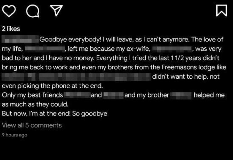 Sâmbătă, la scurt timp după miezul nopţii, austriacul în vârstă de 56 de ani postase pe Facebook şi Instagram o scrisoare de adio.