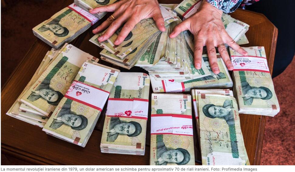 La momentul revoluției iraniene din 1979, un dolar american se schimba pentru aproximativ 70 de riali iranieni. La începutul anului 2026, cursul a depășit 1,4 milioane de riali, ceea ce înseamnă că moneda Iranului și-a pierdut de aproximativ 20.000 de ori din valoare în patru decenii.
