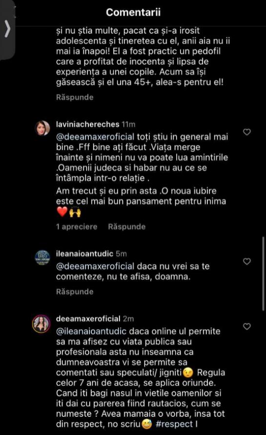 „Dacă online-ul permite să mă afișez cu viața publică sau profesională asta nu înseamnă că dumneavoastră vi se permite să comentați/speculați/jigniți. Regula celor 7 ani de acasă se aplică oriunde. Când îți bagi nasul în viețile oamenilor și îți dai cu părerea fiind răutăcios, cum se numește? Avea mamaie o vorbă, însă tot din respect, n-o scriu”, a fost răspunsul scris de Deea Maxer.