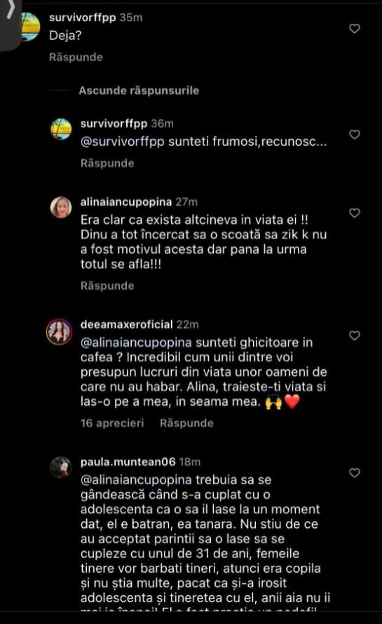 „Era clar că exista altcineva în viața ei. Dinu a tot încercat să o scoată, să zică că nu a fost motivul acesta, dar până la urmă totul se află”, a fost comentariul unei fane, iar Deea i-a răspuns imediat: „Sunteți ghicitoare în cafea? Incredibil cum unii dintre voi presupun lucruri din viața unor oameni de care nu au habar. Alina, trăiește-ți viața și las-o pe a mea în seama mea”.