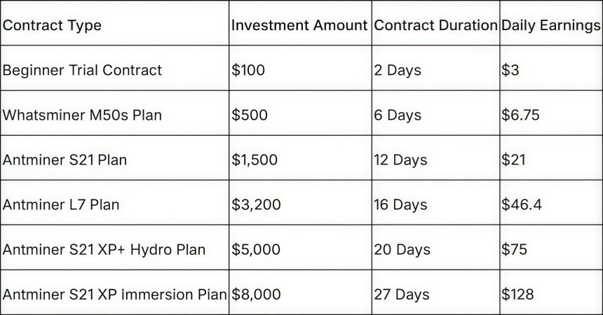 - Alegeți un contract minier: Selectați un plan care se potrivește obiectivelor dvs. de investiții - de la opțiuni prietenoase pentru începători până la contracte cu randament ridicat.