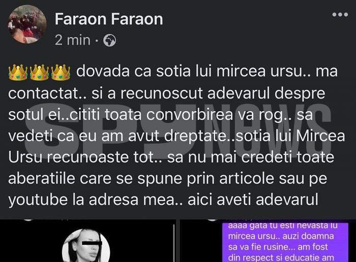 Ce a urmat în familia Ursu... Nu se știe. Cert este, însă, că „Faraonul” a postat după aceea toate conversațiile pe un site de socializare, justificându-și gestul prin faptul că Ursu l-a atacat în spațiul virtual și i-a înjurat copilul.