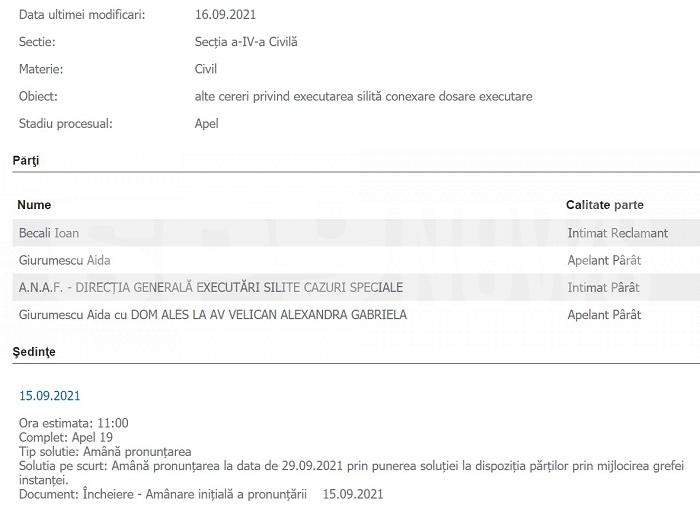 După ce, săptămâna trecută, a amânat pronunțarea, instanța urmează să dea un verdict în cel mai recent dosar al celor doi pe 29 septembrie. Pentru a recupera banii, fosta amantă a cerut scoaterea la licitație a unor apartamente deținute de soții Becali în zona Floreasca din Capitală, însă nevasta lui Giovanni a atacat decizia. „Constată că soţii pârâţi deţin în coproprietate, în cote egale de 50%, imobilele situate în municipiul Bucureşti, sectorul 1, Calea Floreasca nr....., respectiv apartamentul nr.32 (fără carte funciară deschisă) şi apartamentul nr. 33 (înscris în cartea funciară nr....). Sistează starea de coproprietate a soţilor pârâţi. Atribuie pârâtului Becali Ioan bunurile imobile comune, în valoare totală de 288.826,73 euro, ambele situate în municipiul Bucureşti, sectorul 1, Calea Floreasca nr.... Obligă pârâtul la plata sultei către pârâta Becali Stella Narda, în valoare de 144.413,365 euro. Obligă pârâtul la plata cheltuielilor de judecată în sumă de 29.000 lei”, au precizat magistrații, în sentinţa contestată de soția lui Ioan Becali.