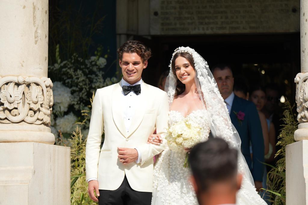 Mireasa a purtat o rochie cu trenă lungă şi un voal spectaculos, iar Ianis a optat pentru o ţinută cu pantaloni negri şi sacou alb, notează agenția New.ro.