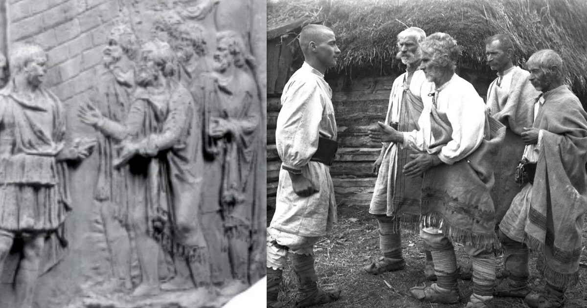 În 1928, câțiva țărani din Lunca Cernii, un sat izolat din Ținutul Pădurenilor, Hunedoara, au fost fotografiați imitând o scenă controversată de pe Columna lui Traian, în care un grup de comates (țărani daci, pletoși) se înfățișa ca solie de pace în fața împăratului Traian.