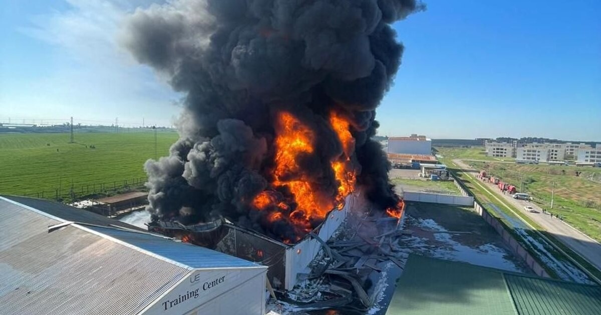 Imagini apărute după atac arată coloane dense de fum ridicându-se din clădire, cu flăcări puternice la nivelul depozitului.