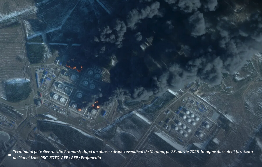 Portul rus Primorsk de la Marea Baltică, unul dintre cele mai mari puncte de export ale țării, a pierdut cel puțin 40% din facilitățile sale de stocare în urma atacurilor cu drone ucrainene efectuate luna trecută, au arătat joi imaginile surprinse de un satelit comercial american și analizate de agenția de presă Reuters.