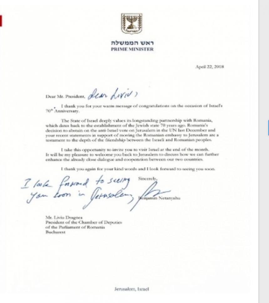 „Dragă Liviu”, așa își începe Netanyahu invitația adresată lui Dragnea. „De abia aștept să ne vedem, curând, în Ierusalim!”, își încheie Netanyahu epistola.