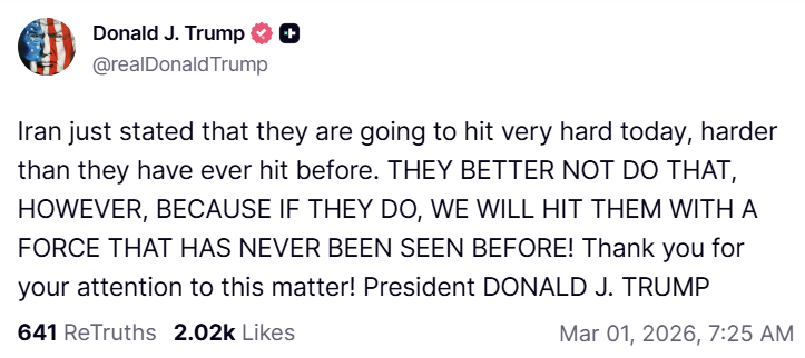 Președintele american Donald Trump a reacționat în scurt timp. „Iranul tocmai a declarat că astăzi va lovi foarte tare, mai tare decât a lovit vreodată“, a scris președintele american pe rețeaua sa, Truth Social.