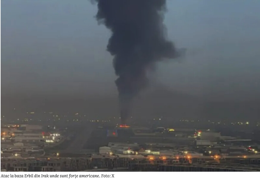 De asemenea, a fost atacată baza aeriană Erbil din Irak. Imagini publicate pe rețelele de socializare arată un nor mare de fum negru deasupra bazei unde se află un contigent de trupe americane, după ce agenția de știri iraniană Fars a afirmat că s-au auzit explozii puternice în orașul irakian.