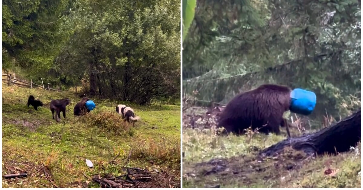 În imagini, ursul cu butoiul pe cap poate fi văzut în timp ce încearcă să se apere de cei trei câini care o înconjoară. Incidentul a fost semnalat de personalul de la Hipparion Trails din Gheorgheni, care a alertat imediat autoritățile. Pădurarii și medicii veterinari au intervenit pentru a salva animalul aflat în suferință.