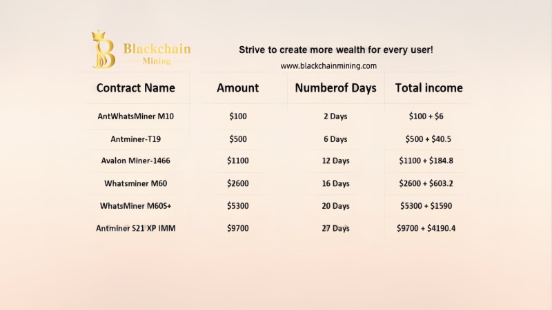 Contracte sustenabile: BlackchainMining oferă o gamă largă de contracte care nu sunt doar ușor de utilizat, ci oferă și o varietate de opțiuni pentru a satisface nevoile dumneavoastră de investiții și a genera randamente stabile și eficiente.