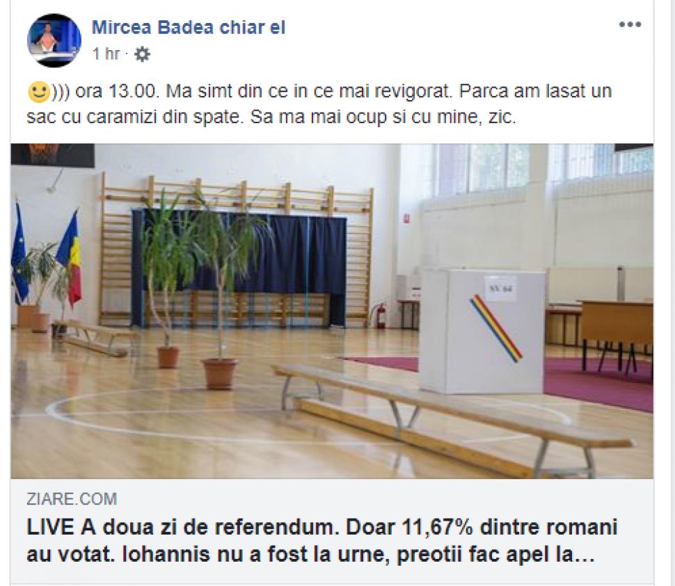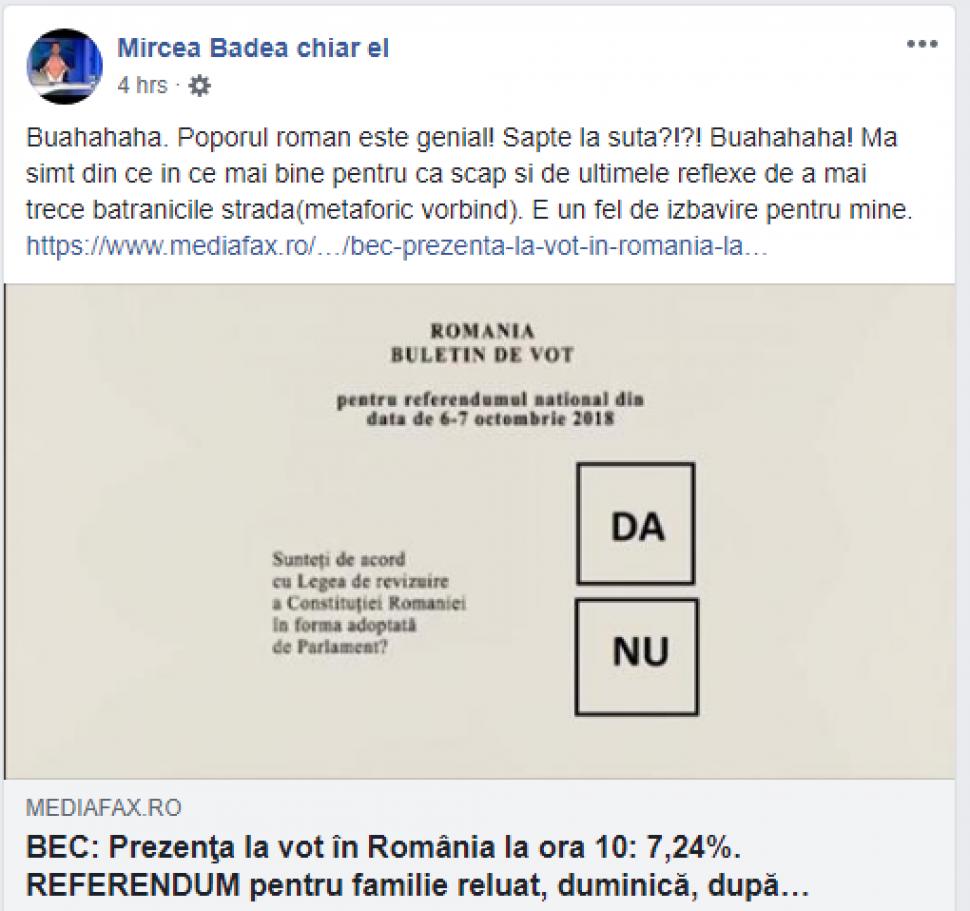 Acum 4 ore: „Buahahaha. Poporul român este genial! Șapte la sută?!?! Buahahaha! Mă simt din ce în ce mai bine pentru că scap și de ultimele reflexe de a mai trece bătrânicile strada (metaforic vorbind). E un fel de izbăvire pentru mine”, a scris duminică Mircea Badea (Antena 3) pe contul său de Facebook.