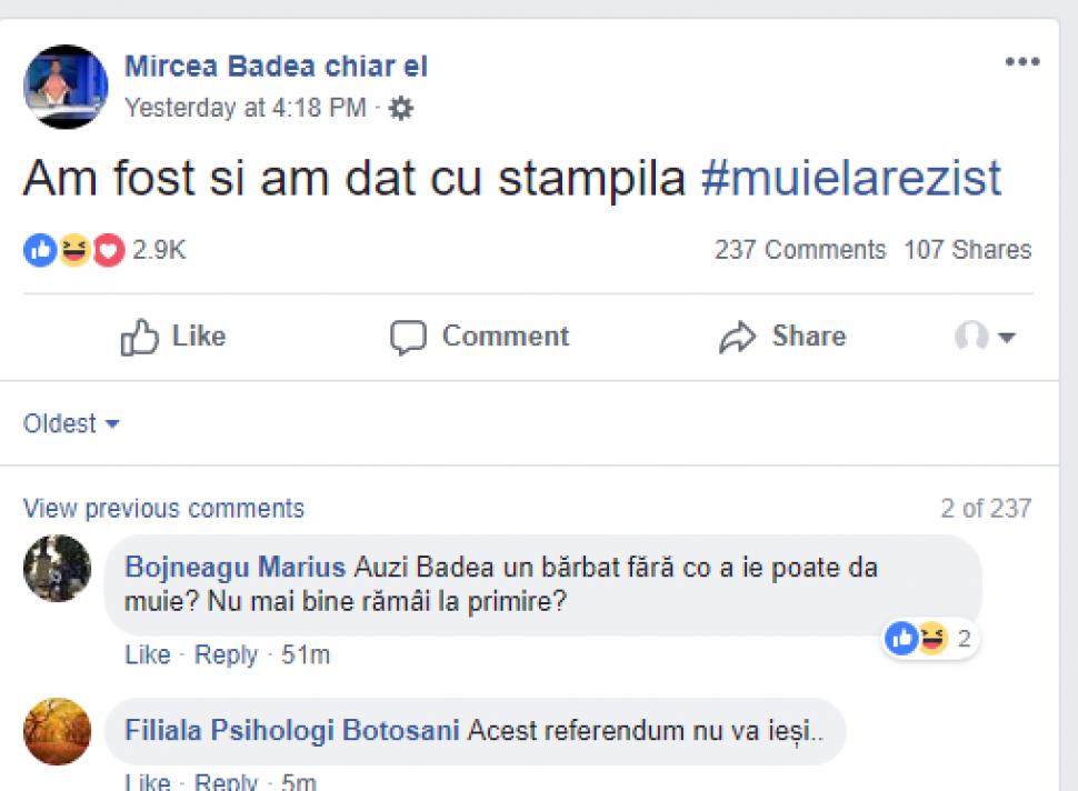 Asta după ce sâmbătă scrisese mândru: „Am fost si am dat cu stampila #muielarezist”. Era atât de sigur pe el că nici nu i-a răspuns celui care l-a și gratulat cu un: „Auzi Badea un bărbat fără co a ie poate da muie? Nu mai bine rămâi la primire?”