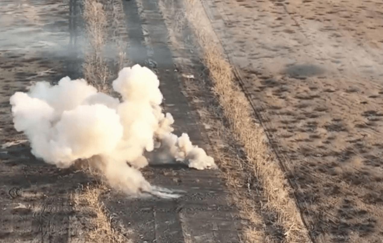 În filmare, se vede cu blindatul rusesc explodează î n timp ce intră pe câmpul înțesat cu mine , iar de pe margine artileriștii ucraineni trag cu obuze asupra lui.