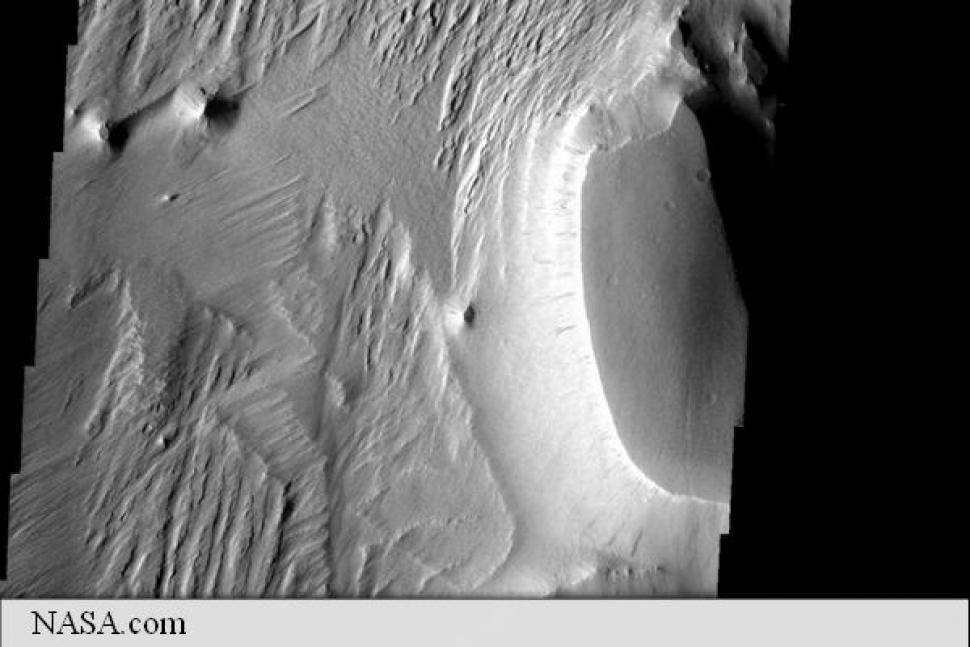 Canelurile distincte și dealurile alungite din această imagine ce reprezintă formațiunea Medusae Fossae de pe planeta Marte sunt cauzate de eroziunea eoliană a unei roci moi cu granulație fină.