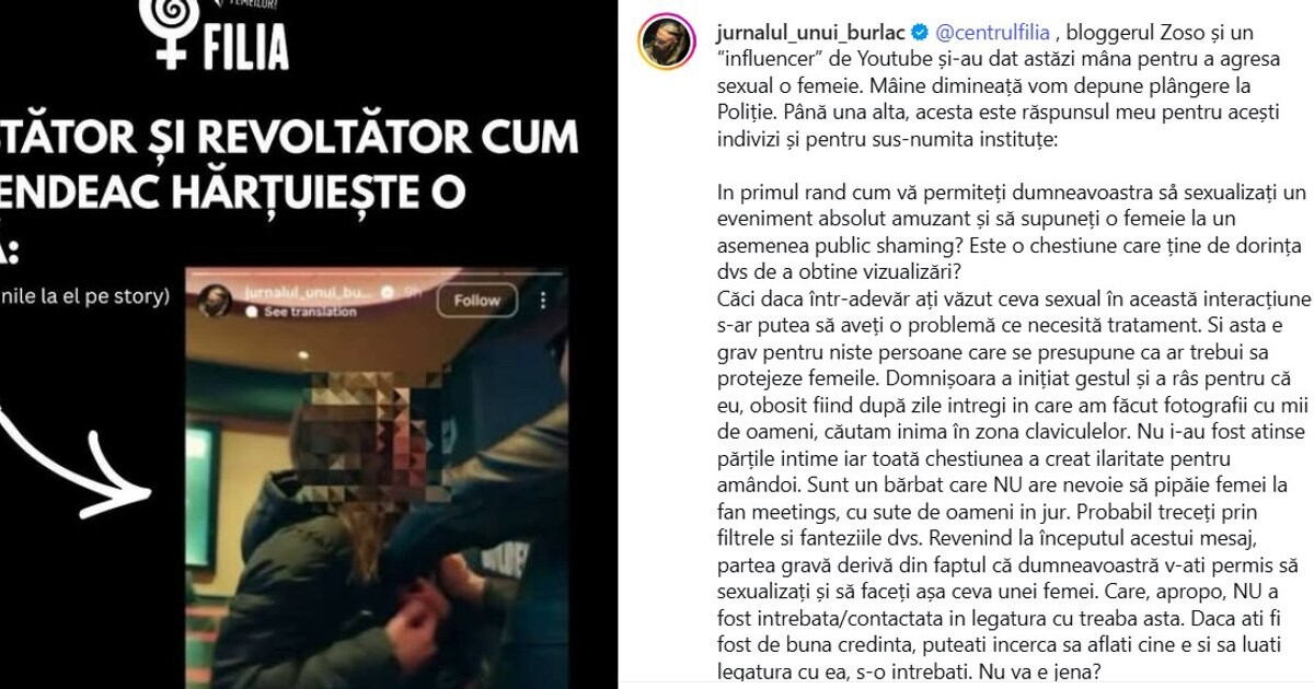 „@centrulfilia, bloggerul Zoso și un «influencer» de YouTube și-au dat astăzi mâna pentru a agresa sexual o femeie. Mâine dimineață vom depune plângere la Poliție. Până una-alta, acesta este răspunsul meu pentru acești indivizi și pentru sus-numita instituție”, a spus actorul.
