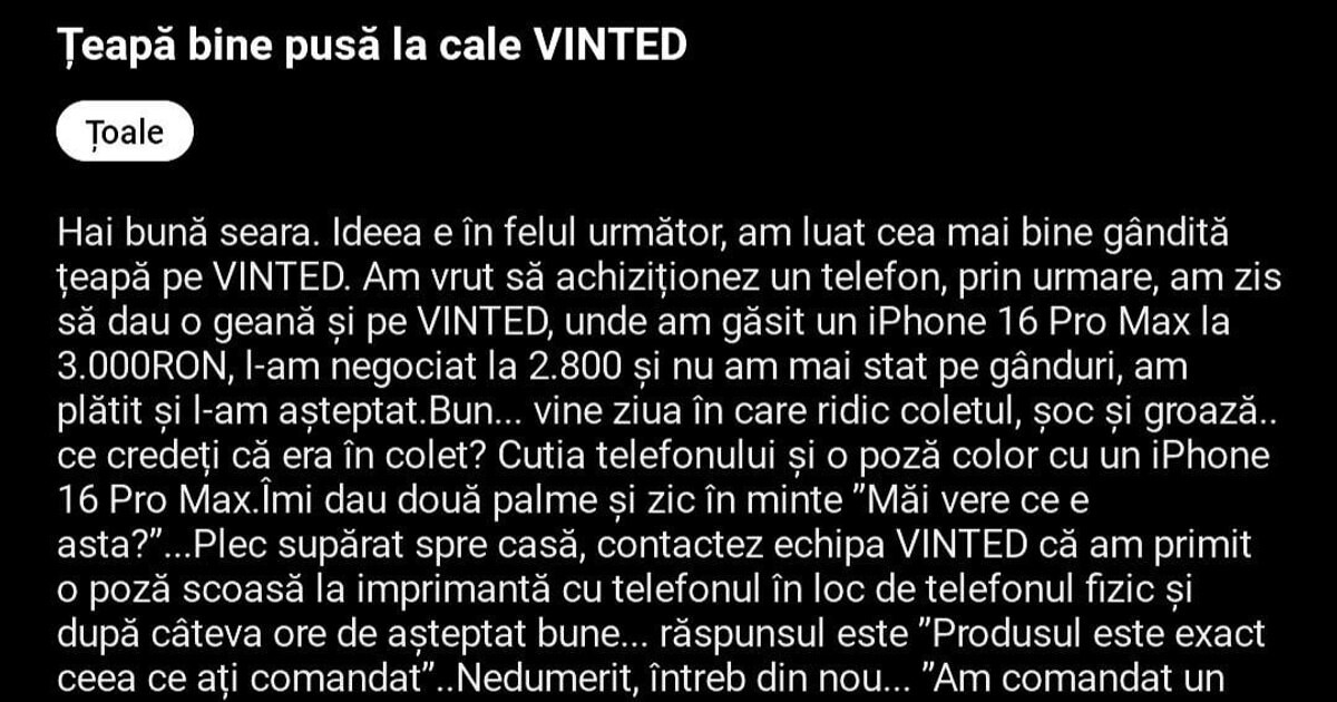 „Bun... vine ziua în care ridic coletul, șoc și groază, ce credeți că era în colet? Cutia telefonului şi o poză color cu un iPhone16 Pro Max. Îmi dau două palme și zic în minte «Măi, vere, ce e asta?»...Plec supărat spre casă, contactez echipa VINTED că am primit o poză scoasă la imprimantă cu telefonul în loc de telefonul fizic și după câteva ore de așteptat bune... răspunsul este «Produsul este exact ceea ce ați comandat». Nedumerit, întreb din nou... «Am comandat un telefon, am primit o poză color scoasă la imprimantă... Vi se pare că am primit ce am comandat?»".