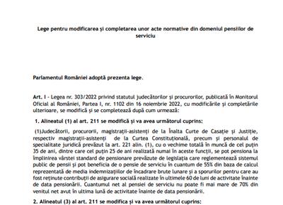 Proiectul stabilește, de asemenea, că judecătorii, procurorii, magistrații-asistenți de la Înalta Curte de Casație și Justiție, magistrații-asistenți de la Curtea Constituțională și personalul de specialitate juridică prevăzut la art. 221 alin. (1), cu cel puțin 35 de ani de vechime în muncă, dintre care minimum 25 de ani în aceste funcții, se pot pensiona la împlinirea vârstei standard prevăzute de legislația sistemului public de pensii, beneficiind de pensia de serviciu menționată.