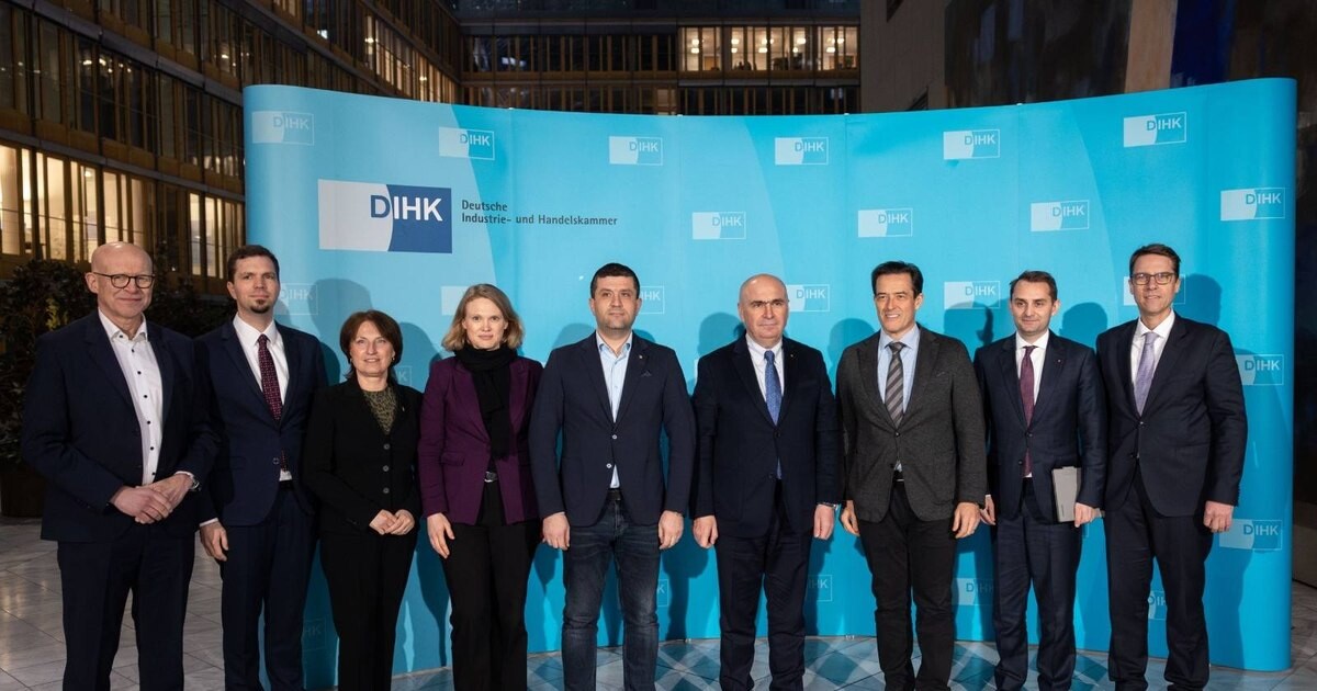 La poza de grup ocazionată de întâlnirea delegației române cu reprezentanții Camerei de Comerț și Industrie a Germaniei, ministrul român al Apărării a apărut într-o postură relaxată, inclusiv vestimentar.