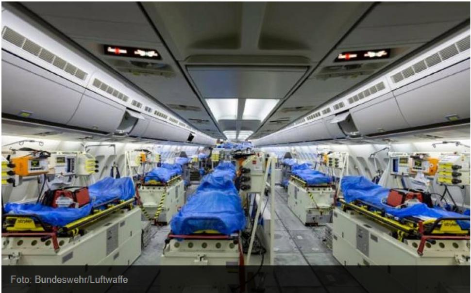 Germania a preluat mai mulţi pacienţi cu Covid-19, aflaţi în stare destul de gravă, din ţările vecine, pentru a-i trata în spitalele sale. Şase pacienţi din Bergamo, Italia, au fost transportaţi pe calea aerului sâmbătă dimineaţa. Pentru aceste operaţiuni Germania foloseşte un Airbus A310 MedEvac, o adevarată secţie de terapie intensivă cu aripi. Avionul aparţine Forţelor Aeriene Germane.