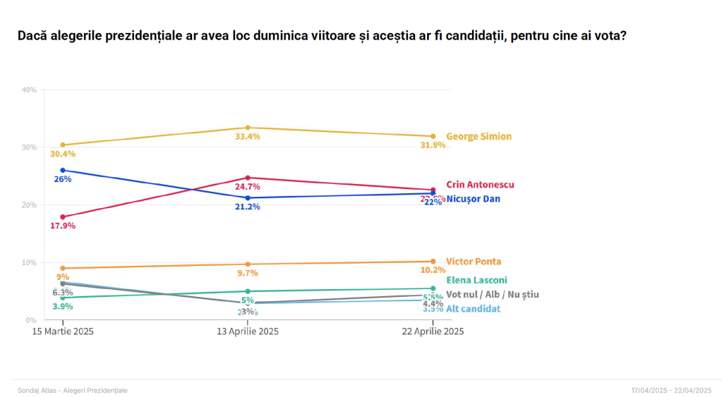 Potrivit cercetării, George Simion este creditat cu 31.9% din opțiunile celor care au răspuns la întrebare. Asta înseamnă că, după ce în perioada 10-13 aprilie crescuse cu 3 procente față de luna martie, acum, candidatul AUR a pierdut jumătate dintre acestea.