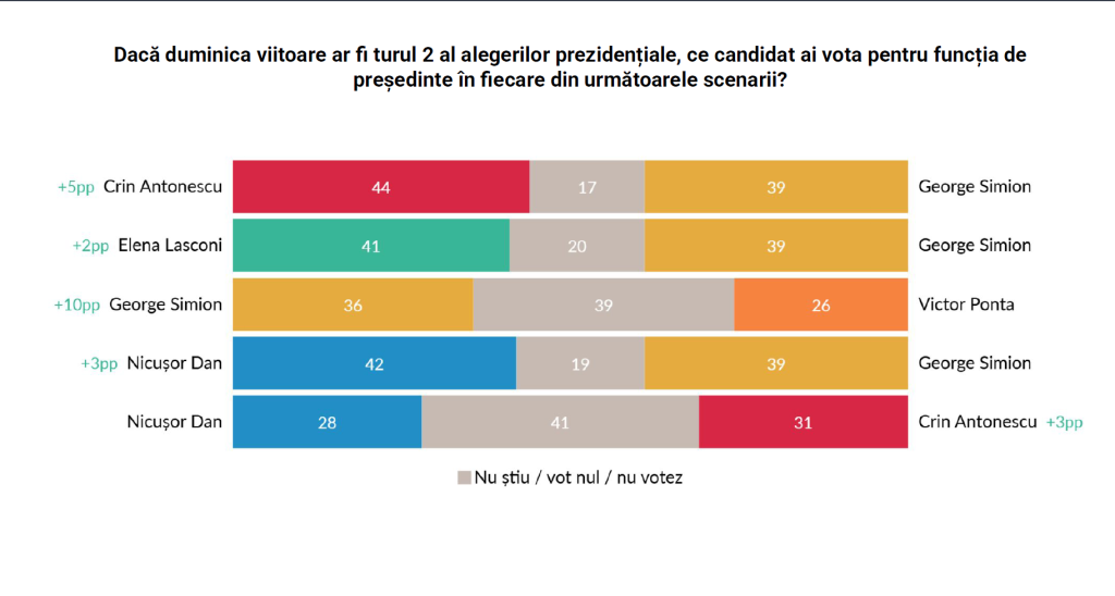 Totuși, avansul lui Crin Antonescu față de George Simion scade de la 12.9% la 5%, avansul Elenei Lasconi față de Simion scade de la 3.5% la doar 2%, avansul lui Nicușor Dan vs. George Simion scade de la 3.2% la 3%.