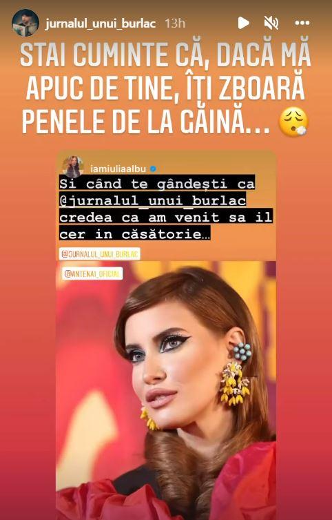Iulia Albu, jurata emisiunii Splash! Vedete la apă, a făcut în urmă cu puțin timp o postare pe Insta Story referitoare la faptul că va merge la iUmor pentru un roast legendar. La descriere, pe fotografie, ea a adăugat “Și când te gândești că @jurnalul_unui_burlac credea că am venit să îl cer în căsătorie...”.