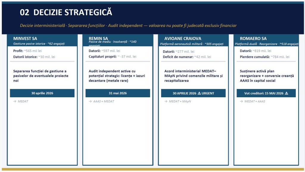 „A doua categorie este decizie strategică. Avem cele patru companii aflate în portofoliul Ministerului Economiei. Minvest, Remin, Avioane Craiova şi Romaero. În aceste companii este nevoie de o decizie interministerială, asta este recomandarea, în primul rând pentru Avioane Craiova şi Romaero, iar la Remin şi la Minvest o separare a funcţilor şi o auditare independentă a resurselor pe care aceste companii încă le deţin”, a spus Oana Gheorghiu.