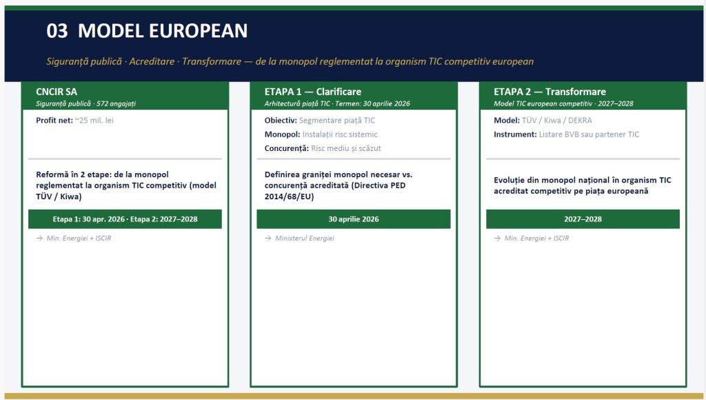 Vicepremierul a mai anunţat că a treia categorie este transformarea pe model european şi aici intră CNCIR (Compania Națională pentru Controlul Cazanelor, Instalațiilor de Ridicat și Recipientelor sub Presiune).