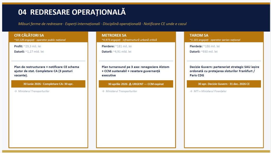 Potrivit vicepremierului, a patra categorie este redresare operaţională: CFR Călători, Metrorex şi Tarom.