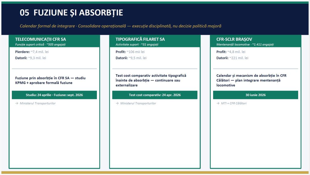 „A cincea categorie este fuziune şi absorbţie şi avem aici câteva companii, Telecomunicaţii CFR, Tipografica-Filaret, CFR-SCLR Braşov. Aici vorbim despre un calendar ferm, agreat cu Ministerul Transporturilor de Integrare şi Consolidare Operaţional”, a mai spus vicepremierul.