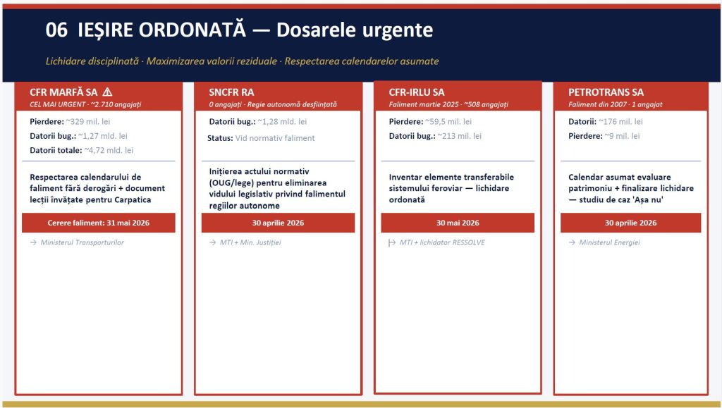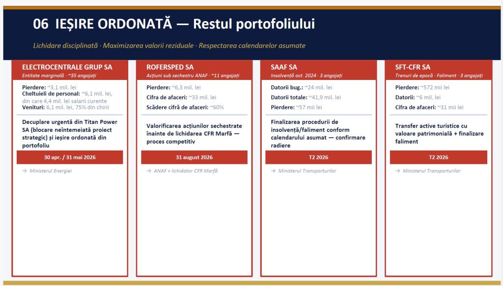 Gheorghiu a mai afirmat că „a şasea categorie este ieşirea ordonată din portofoliu (n.a. lichidarea): Electrocentrale Grup, Petrotrans, CFR Marfă, Rofersped, CFR IRLU, SAAF, CFT-CFR şi SNCFR-ERA.