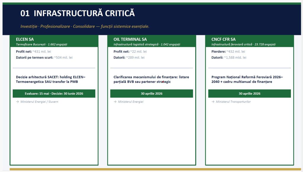 „Prima categorie, infrastructură critică. Aici avem Elcen, Oil Terminal şi CFR SA. În aceste companii este nevoie de investiţie, de profesionalizare, de bună guvernanţă şi de consolidare a situaţiei financiare”, a spus Oana Gheorghiu.