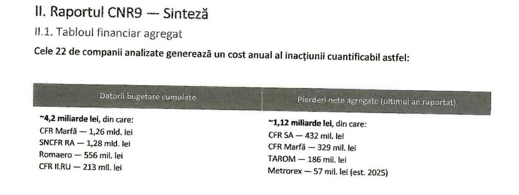 „Cele 22 de companii de stat au acumulat datorii bugetare cumulate de aproximativ 4,2 miliarde de lei datorii istorice şi au înregistrat pierderi nete agregate de aproximativ 1,12 miliarde de lei în ultimul an raportat. Aceasta este factura anuală pe care românii o suportă, din cauza menţinerii statusului actual al acestor companii, fără nici o decizie de reformă până la acest moment”, a declarat Oana Gheorghiu, citată de News.ro.