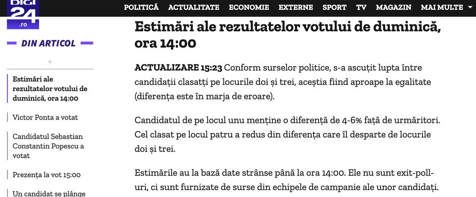 Digi 24: Conform surselor politice, s-a ascuțit lupta între candidații clasatți pe locurile doi și trei, aceștia fiind aproape la egalitate (diferența este în marja de eroare).