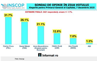 Conform sondajului de opinie INSCOP Research, voturile bucureștenilor pentru poziția de Primar General al Capitalei se distribuie după cum urmează: 31.7% Ciprian Ciucu (PNL), urmat de Daniel Băluță (PSD) cu 26.1% dintre opțiuni, Anca Alexandrescu (independentă sprijinită de AUR și PNȚCD) 21.1%, Cătălin Drulă (USR) 12.8% și Ana Ciceală (SENS) 7%. Alți candidați înscriși în cursă au cumulat 1.3% din voturi.