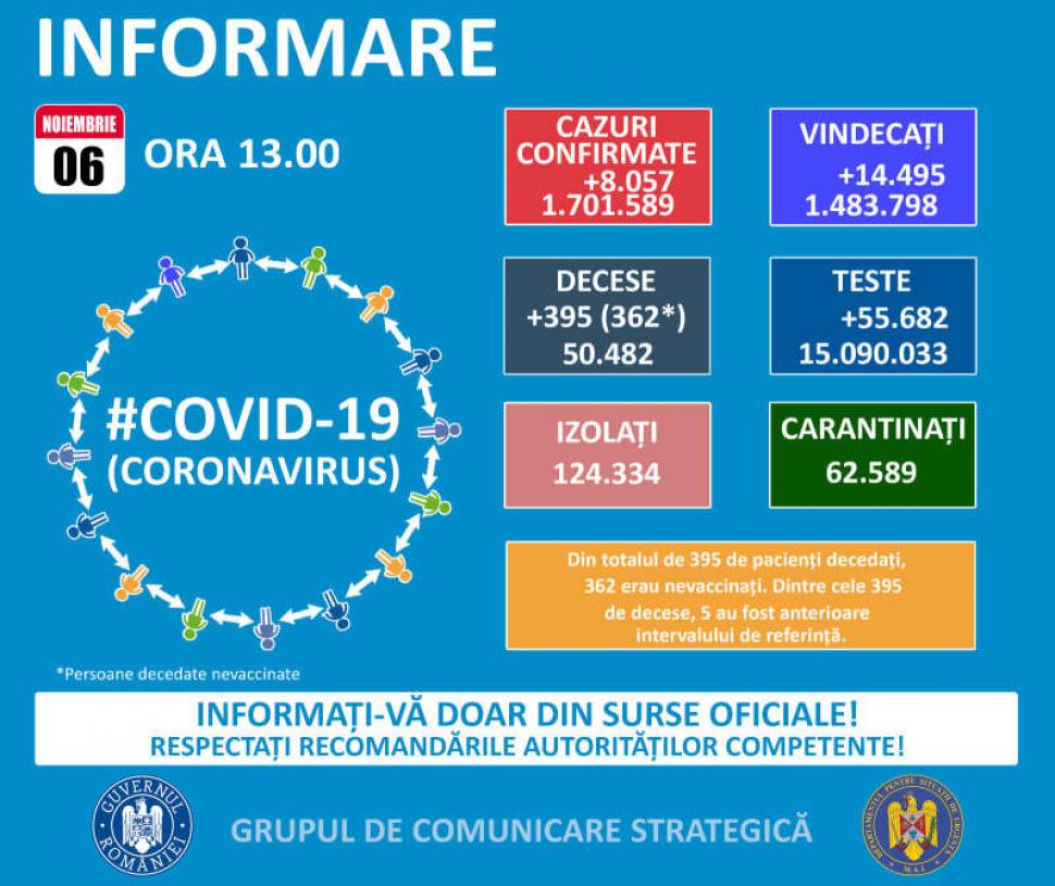 Un număr de 8.057 de cazuri noi de persoane infectate cu SARS-CoV-2 au fost înregistrate în ultimele 24 de ore, fiind efectuate peste 55.000 de teste, a informat, sâmbătă, Grupul de Comunicare Strategică.