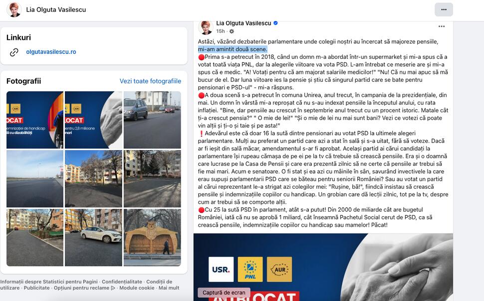A doua scenă s-a petrecut în comuna Unirea, anul trecut, în campania de la prezidențiale, din mai. Un domn în vârstă mi-a reproșat că nu s-au indexat pensiile la începutul anului, cu rata inflației. "Bine, dar pensiile au crescut în septembrie anul trecut cu un procent istoric. Matale cât ți-a crescut pensia?" " O mie de lei!" "Și o mie de lei nu mai sunt bani? Vezi ce votezi că poate vin alții și ți-o și taie și pe asta!”, a scris Olguța Vasilescu pe Facebook miercuri, după ce social-democrații nu au reușit să treacă în comisiile de buget amendamentul privind acordarea unor ajutoare sociale.