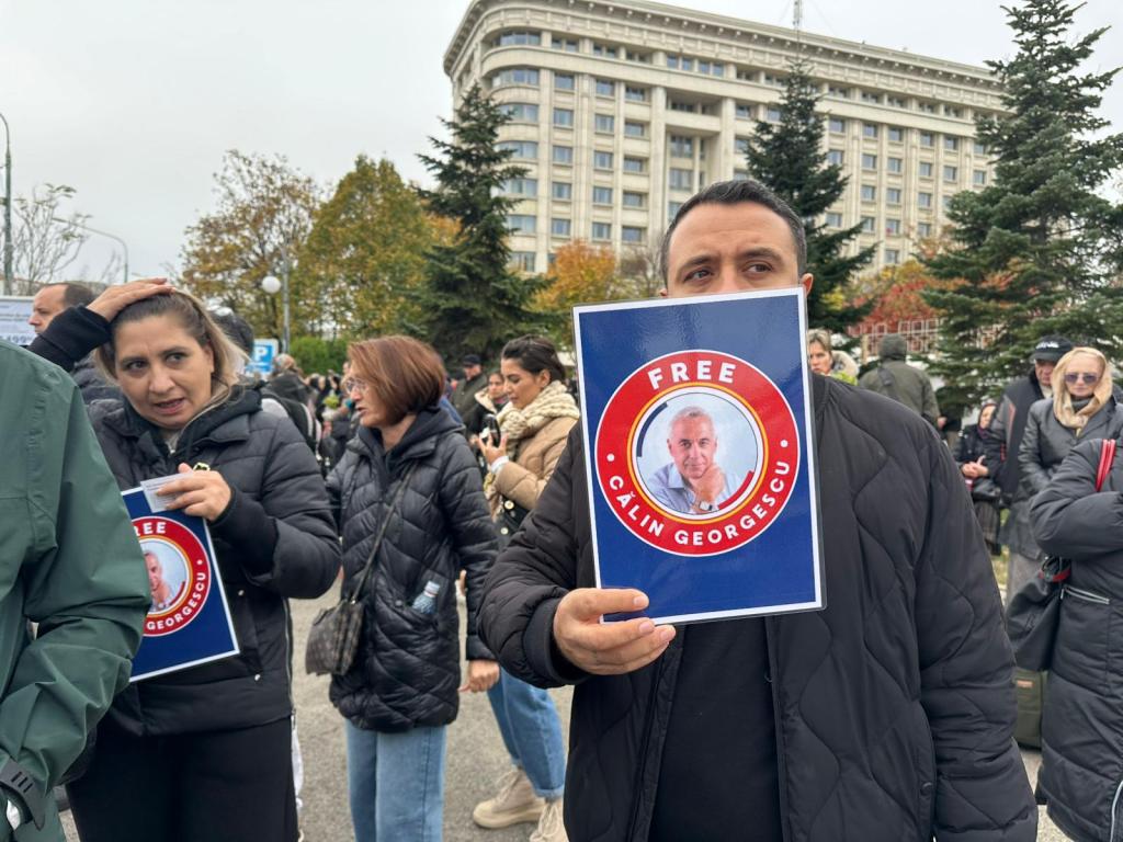Un grup mic de persoane se plimbă prin mulțime cu pancarte pe care scrie „Free Călin Georgescu”.