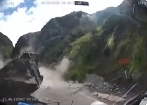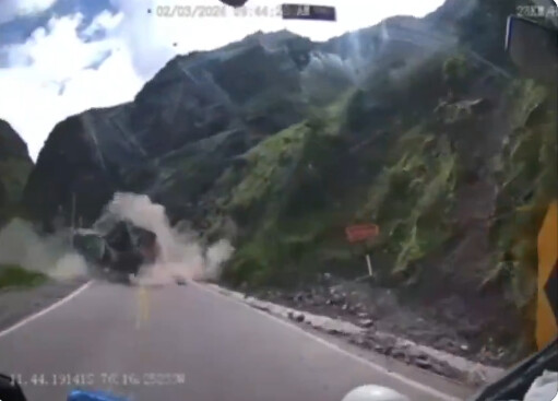 Huge falling rocks hit a truck on a mountainous road in Peru.